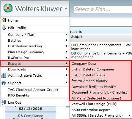 Designated Admin users can access plan document reports from the Wolters Kluwer menu, select Reports, followed by the report you wish to access.