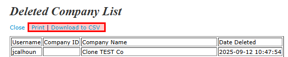 2. List of Deleted Companies - provides a list of companies deleted from your account detailing the Username, Company ID (if applicable), Company Name, and Date Deleted. This report can be printed or downloaded to a CSV file.