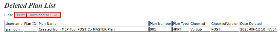 3. List of Deleted Plans - provides a list of plans deleted from your account detailing the Username, Plan ID (if applicable), Plan Name, Plan Number, Plan Type, Checklist, Checklist Version, and Date Deleted. This report can be printed or downloaded to a CSV file.