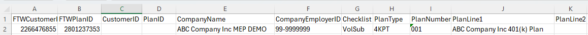 5. Download ftwilliam Plan IDs - generates a CSV file of all plans on your account. Provides FTW Customer ID, FTW Plan ID, Customer ID (if applicable), Plan ID (if applicable), Company Name, Company EIN, Checklist, Plan Type, Plan Number, and Plan Name.