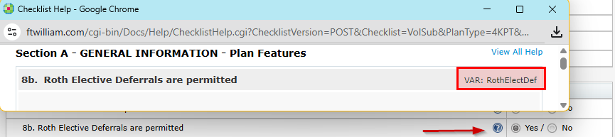 - Tip: Locate a specific plan provision by searching for its column header (VAR); you can find the VAR in the plan checklist by clicking the help (?) icon next to the question. For example, to find which plans offer Roth contributions, you can go the plan checklist, click on the "?" next to A.8b. to locate the VAR in the upper right corner of the help text. You can then do a search for the VAR in the CSV file. The VAR will be listed as the column header.