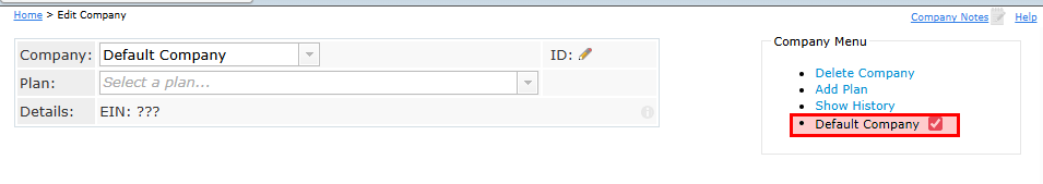 Once the company has been added, select the company as the "Default Company" by checking the box under the Company Menu. This ensures that all plans under this company will appear in the list of default options when adding a new plan to your account.