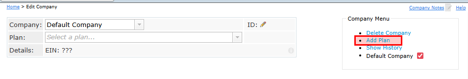 Within the default company, on the Edit Company page, you can add plans via the "Add Plan" link located under the Company Menu. As with the company, provide a name for the plan that makes it easy to identify as your default plan.