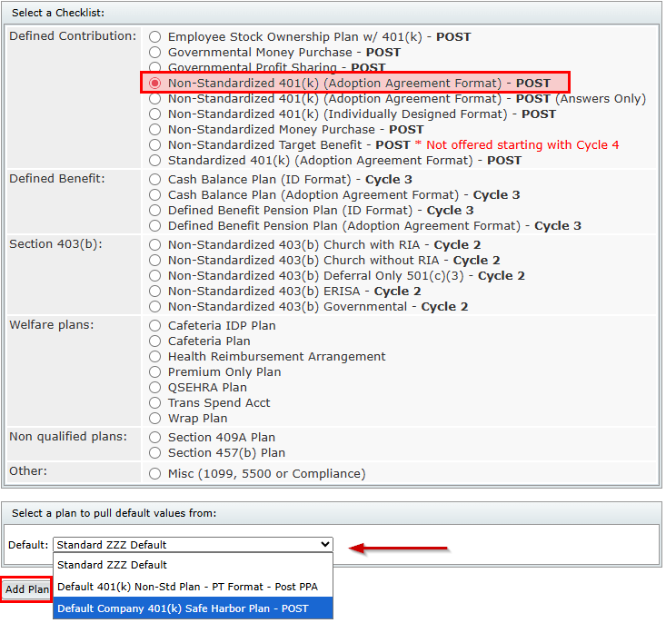 The Default Plan feature allows you to streamline adding plans by designating a specific company and plan(s) as your primary choice. You can create an unlimited number of default plan checklists for the same plan type. For example, you can have multiple Default Plans with various provisions for the Non-Standardized 401(k) (Adoption Agreement Format).