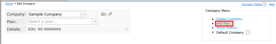 5. Once you have added your company, you can add a new plan via the "Add Plan" link under the Company Menu.