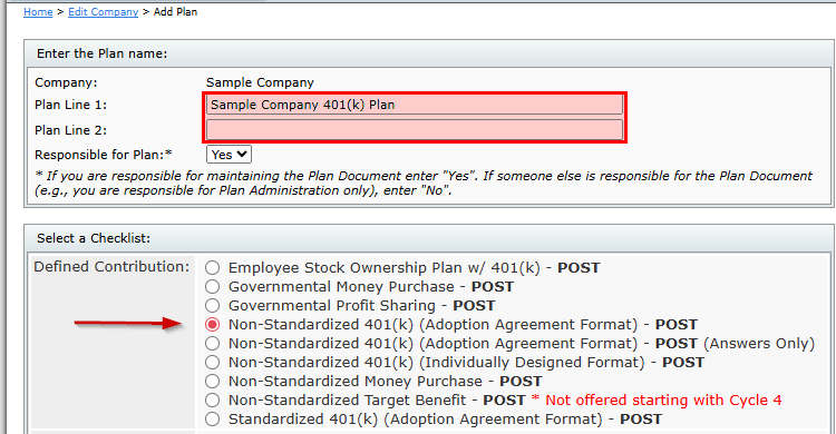 6. Enter the Plan Name and select your desired checklist type from the list.