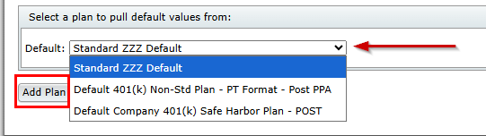 7. You can select a plan to pull default values from. If you do not have Default Plans set up on your account, your only option will be ZZZ Default. What you have selected in your ZZZ-Default checklist for the selected plan type will populate in your added plan. Click on the "Add Plan" button at the bottom of the page.