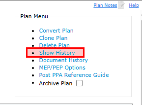 To access the Show History page, click on the "Show History" link located under the "Plan Menu" on the Edit Plan page.