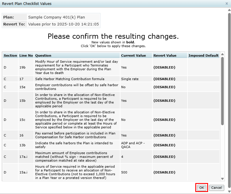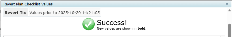 After clicking on the "Revert" link, a pop up window will generate of the Revert Plan Checklist Values providing a summary of all values that will be reverted. Click "Ok" at the bottom to proceed.