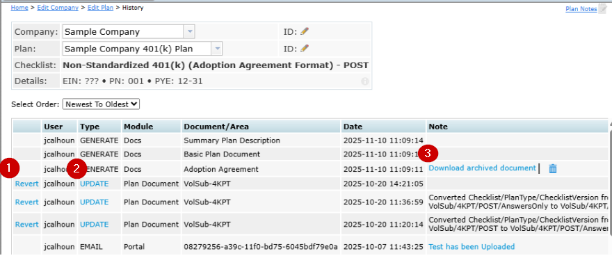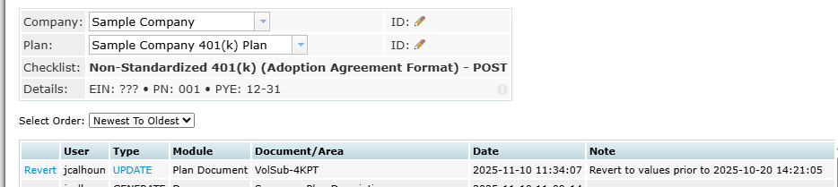 The Show History page enables users to review modifications made to plans across all modules that you subscribe to. Users with with Designated Administrative permissions can revert changes made to the document checklist from this page. In addition, you can view historical version of the Adoption Agreement or Plan Documents (Individually Designed format), that were generated after October 31, 2025.