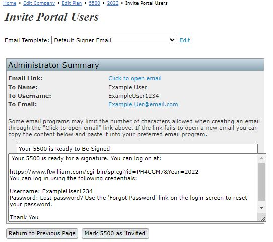 - Invited: At least one signer has been invited to sign the filing via the portal. After sending the Invitation Email to your client(s), you will want to select the option to "Mark 5500 as Invited." This will change the "Signed Status" line from "Not Signed" to "Invited."