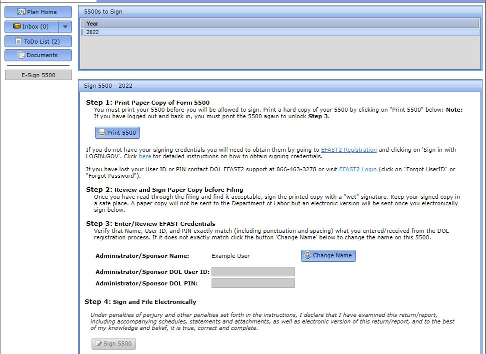 [Print 5500 Button]If you do not have your signing credentials you will need to obtain them by going to EFAST2 Registration and clicking on 'Sign in with LOGIN.GOV. Click here for detailed instructions on how to obtain signing credentials.