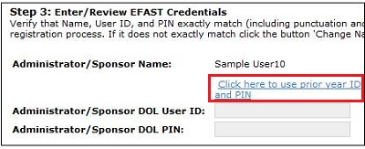 If you have lost your User ID or PIN contact DOL EFAST2 support at 866-463-3278 or visit EFAST2 Login (click on "Forgot UserID" or "Forgot Password").